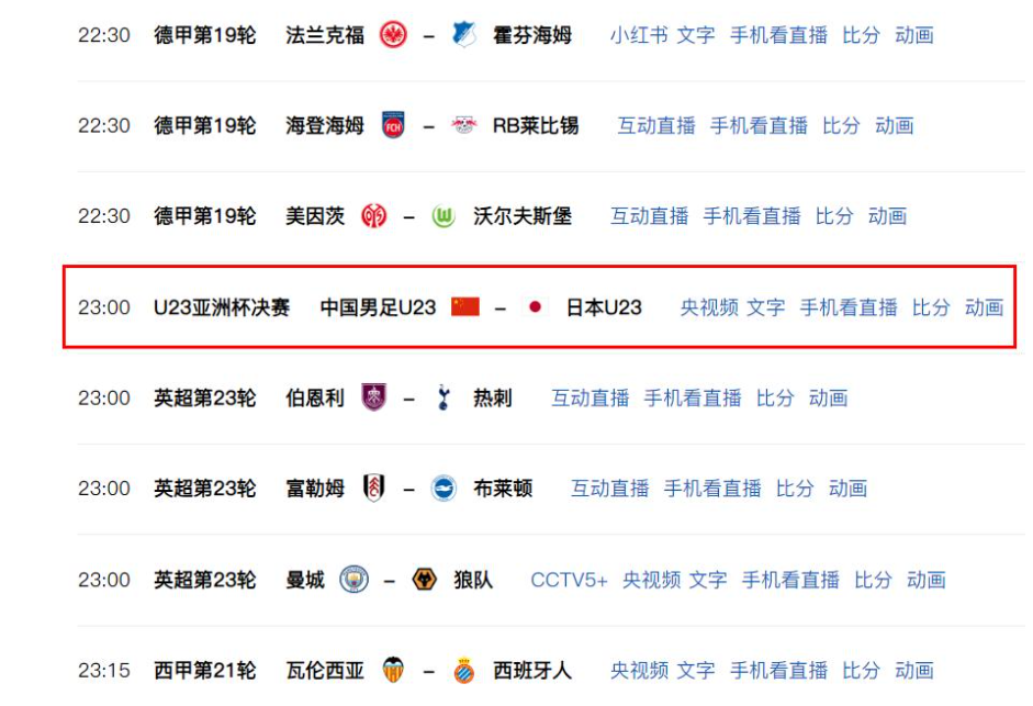 在此之前的U23亚洲杯决赛,央视从未安排转播,随着中国队一路爆冷晋级决赛,也是安排CCTV5频道直播,只是时间变来变去,最开始晚上22点00分,随后晚上19点30分,再是晚上23点30分,决赛变为23点00分,球迷需要注意,依然需要熬夜观赛。